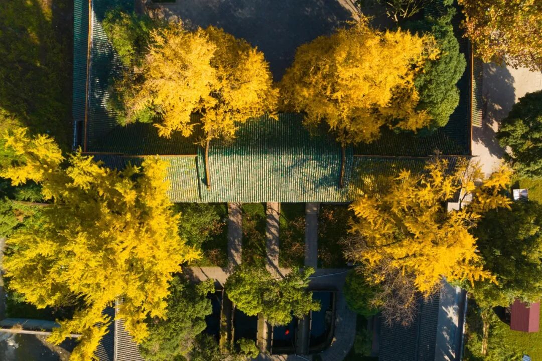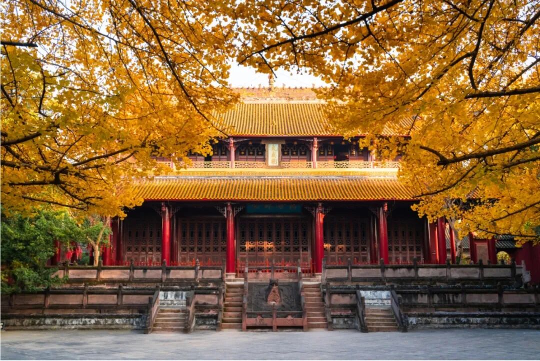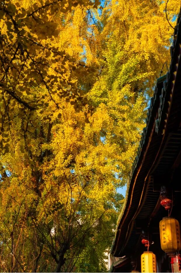 古观与银杏是冬日美景绝配,高大金黄的银杏如伞如盖,衬托着古朴典雅的 忠孝二亭 更添一份静谧与美好。