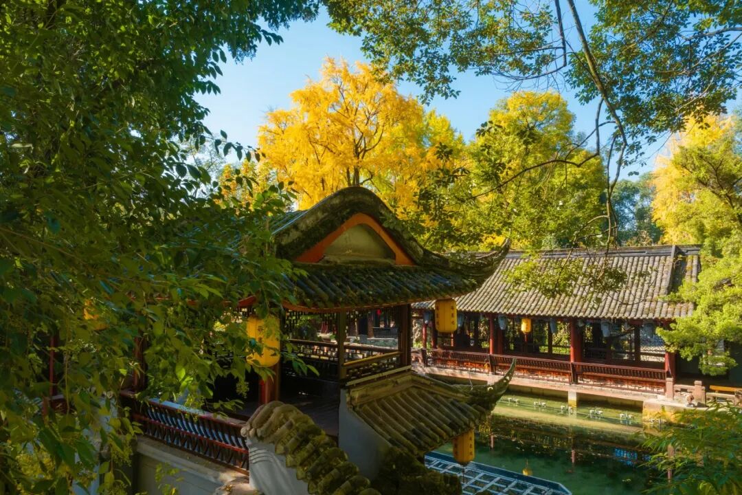 罨画池内一步一景,红墙黛瓦的大成殿与青黄交错的银杏叶相互映衬,一片片扇形的叶子在阳光的照耀下熠熠生辉,仿佛是天空遗落人间的金色星辰。