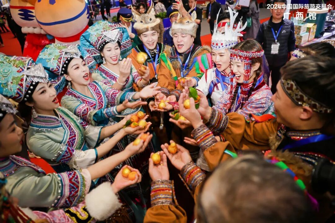 现场还有民歌、民族乐器演奏等极具广西特色的文艺展演。来自广西的梢丽组合唱着山歌,带着甜蜜水果来到黑龙江、辽宁、湖北、内蒙等展区,邀约大家“冬游广西”。这一举动吸引了大量参展商、旅行商的围观,广西的民族风情和热情好客的形象深入人心。