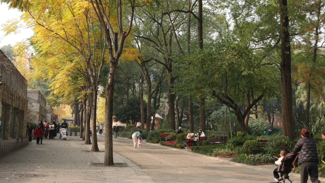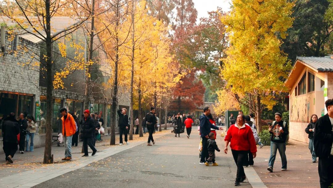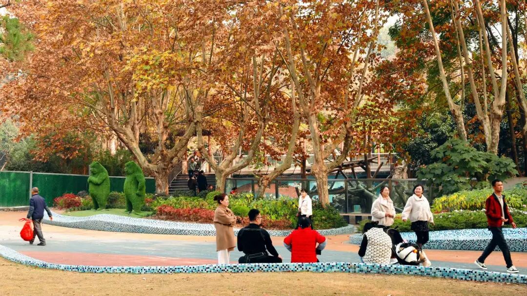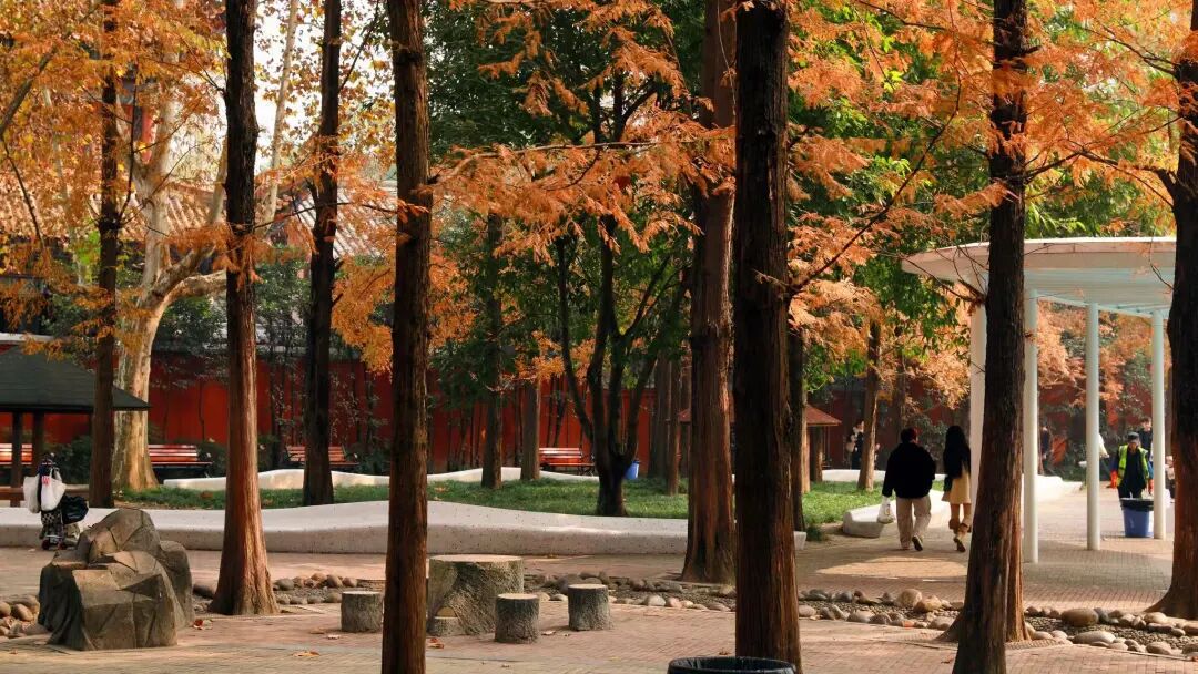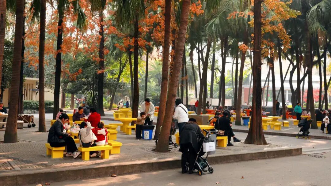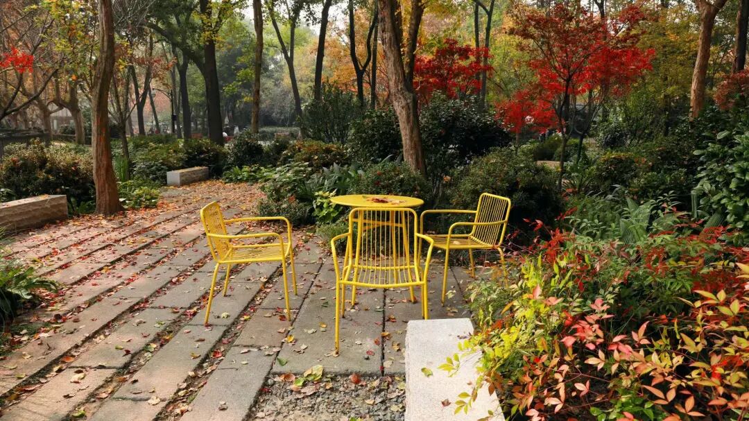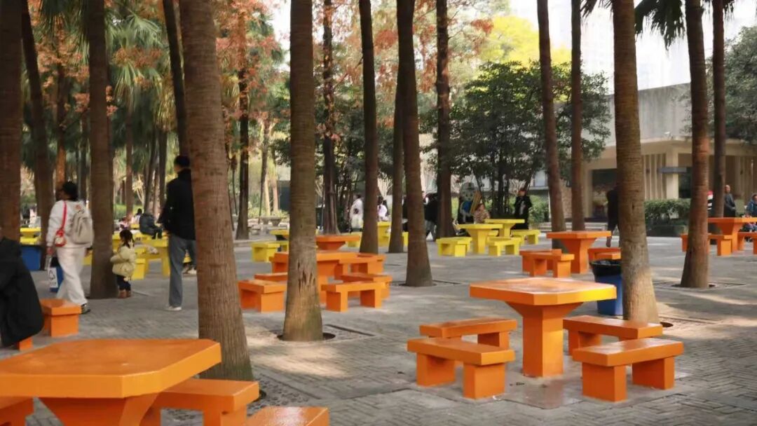 林下彩色的石凳像秋天的调色盘,游客们坐在这里尽情享受惬意的美好时光。