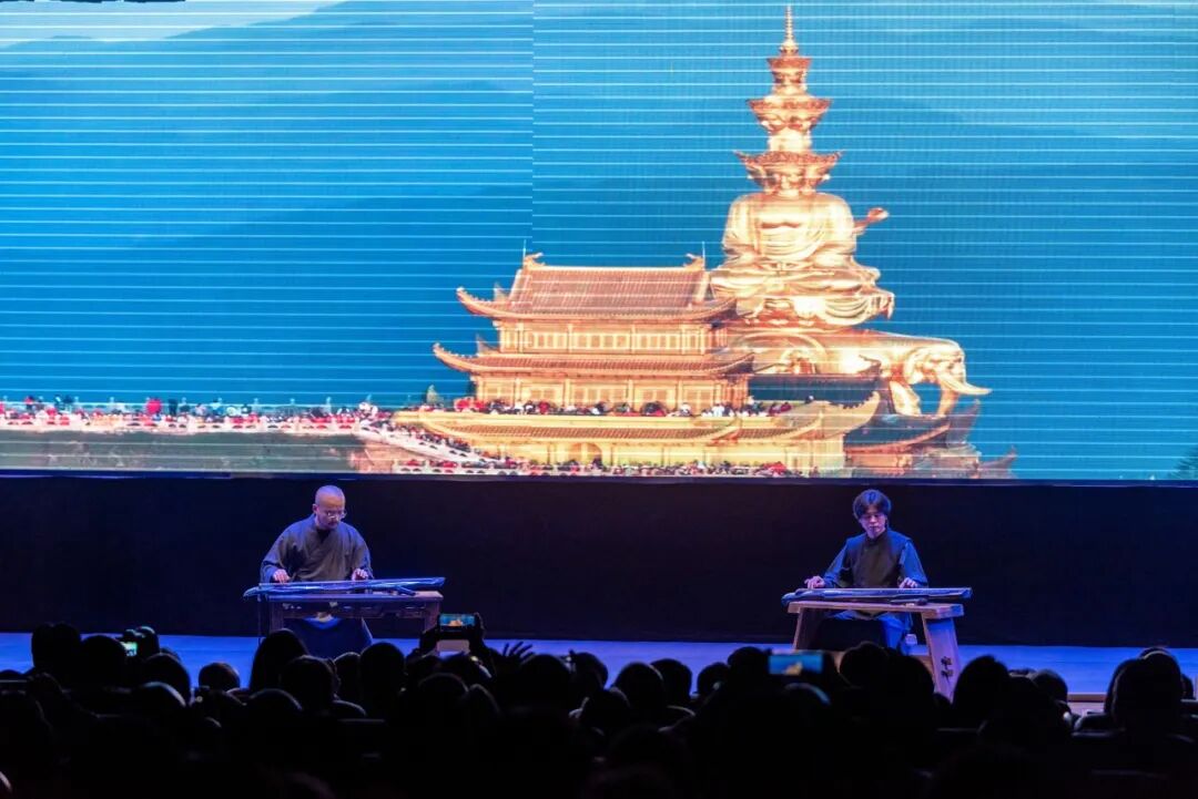 成涛师父和刘宇老师合作带来了《普贤菩萨圣号》的古琴表演,他们的演奏庄重而神圣,让观众们感受到了普贤菩萨的慈悲与智慧;
