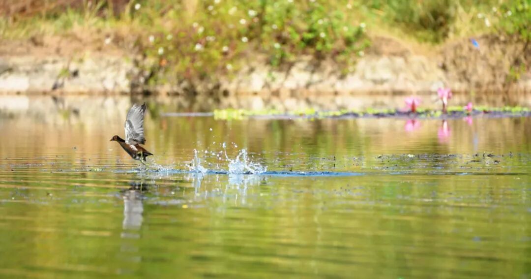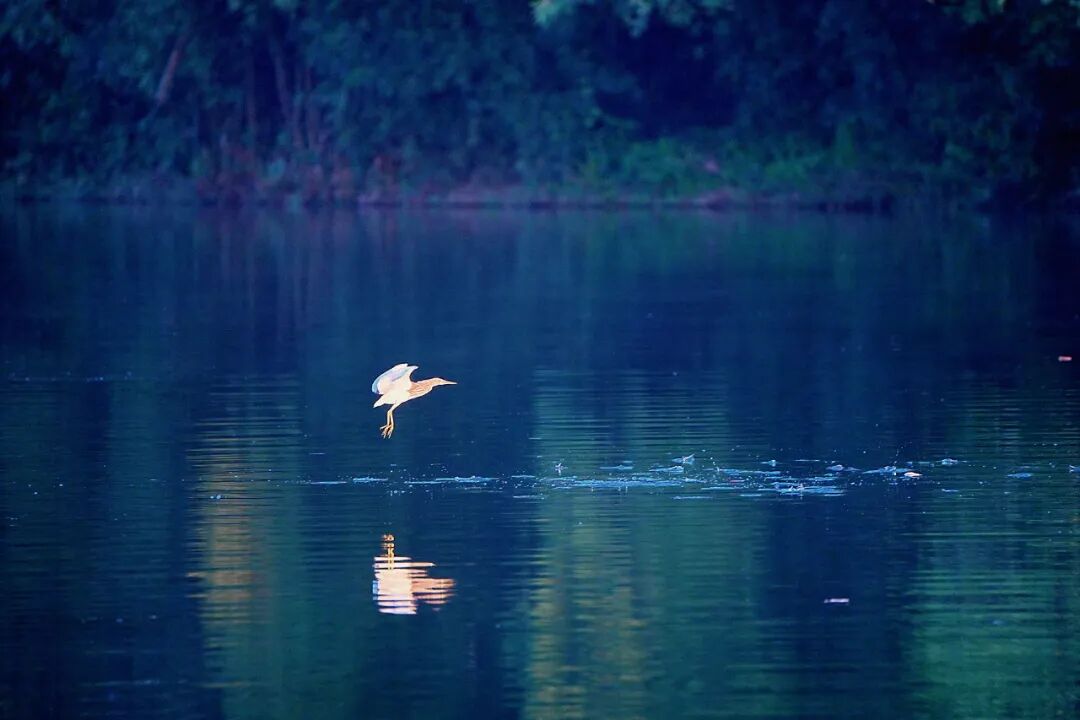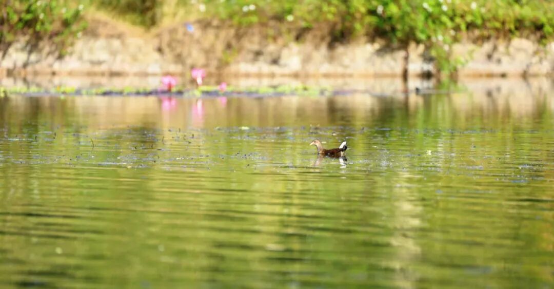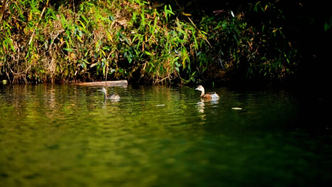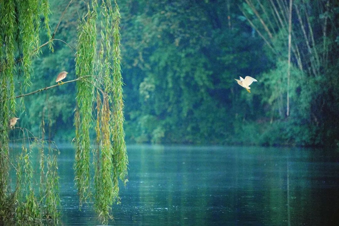 最动人的,莫过于河中的生灵。小䴙䴘悠然浮游于水面,时而倏然潜入水深处,为静谧的山水平添了几分生趣。不远处,黑水鸡静立水面,轻划脚掌在水面掠行,尾尖扫过,留下几缕细碎水纹。岸边树梢上,池鹭倏然振翅,或直冲向远山,或俯身点水啄食。这些生灵自在栖息,不惧人扰,恰是遇龙河生态静好、万物共生的生动注脚。