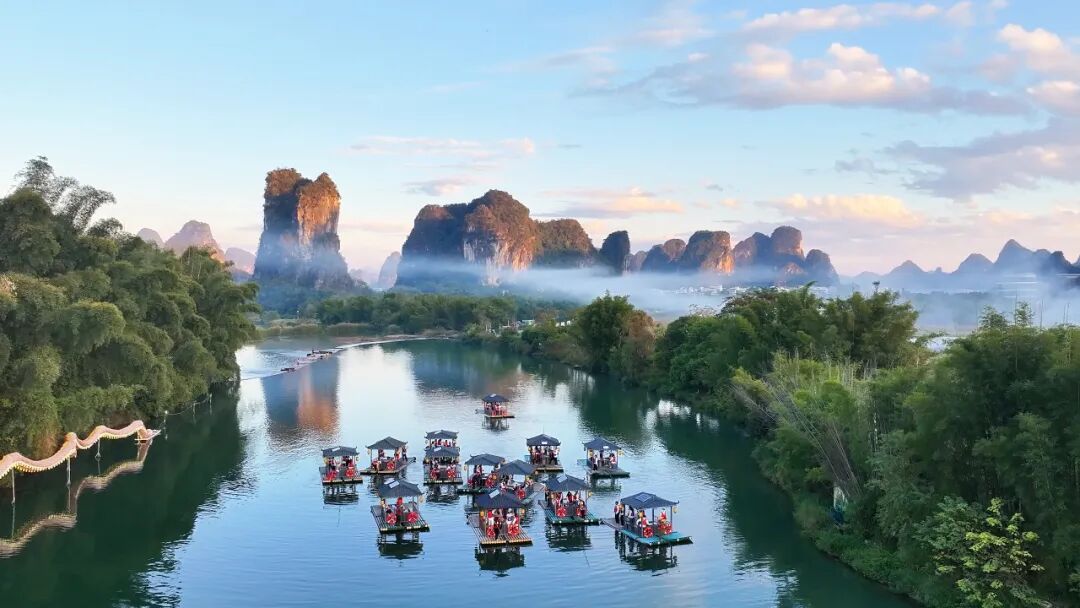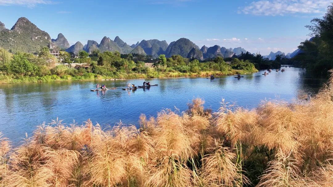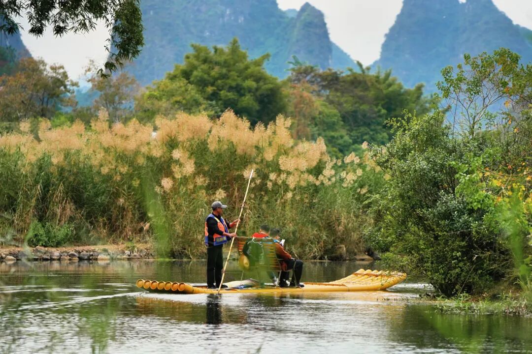 在遇龙河乘筏,无需言语,只需静静感受风的轻拂、水的流淌、鸟的欢鸣,便觉所有的喧嚣都被这山水滤去,心中只剩下纯粹的安然。