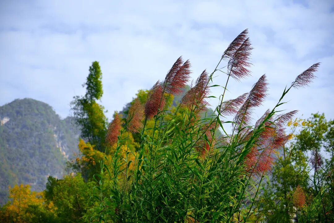 不同于春夏的浓墨重彩,冬日的遇龙河多了几分清旷疏朗。两岸的凤尾竹褪去了些许翠绿,随风而过簌簌作响,像是在低声诉说着遇龙河的故事。岸边芦苇泛出浅黄,修长的秆子顶着蓬松的芦花,在风中轻轻摇曳。黛色的山影浸在澄澈的河水中,分不清是山在水中,还是水在山间。