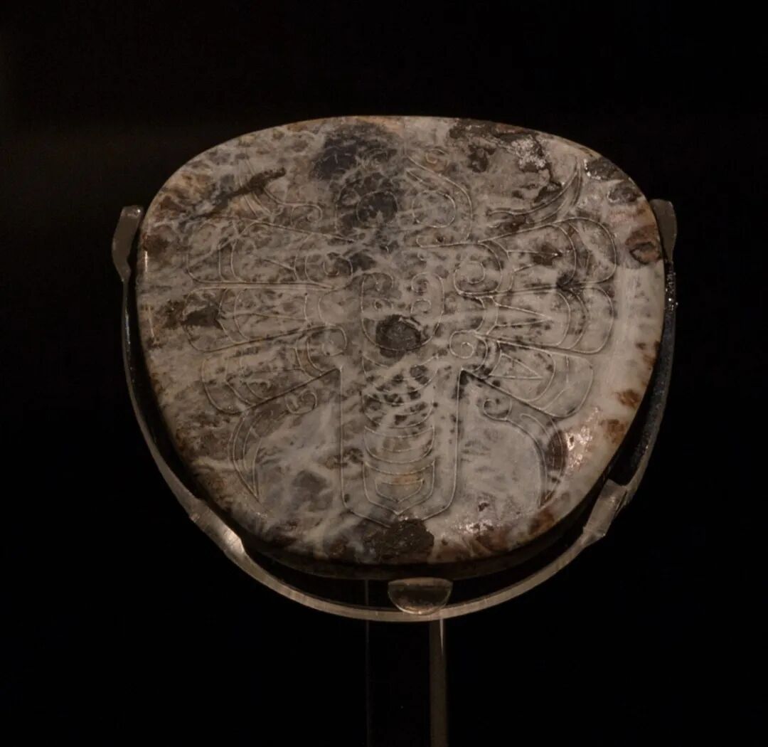 端详这枚玉牌,你会发现上面精心刻画着一个奇特的昆虫图案。该纹饰共有三对翅翼,躯体线条婉转,眼部刻画简练,形态别具一格。这究竟是什么昆虫?